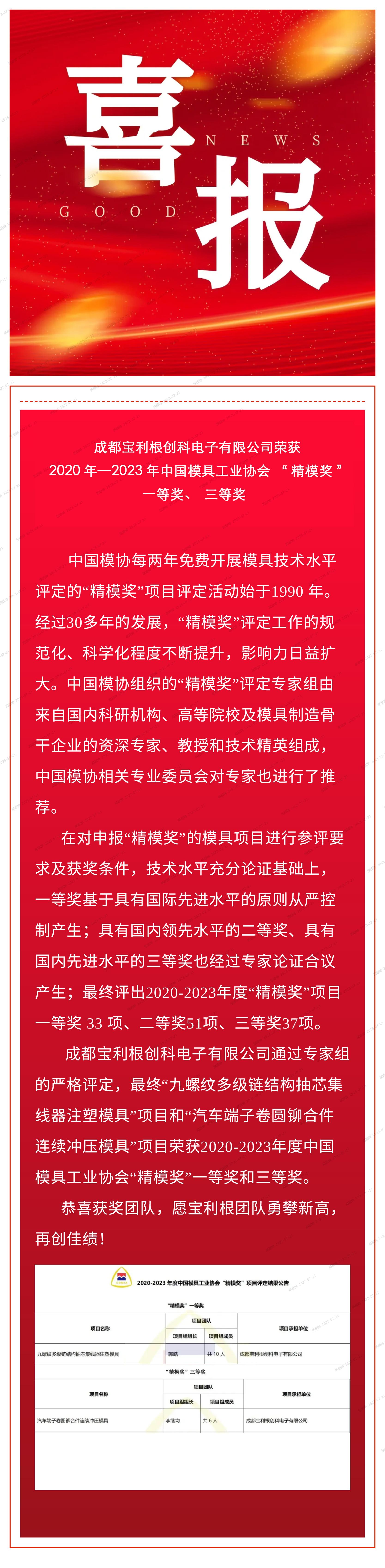 喜報——成都寶利根創(chuàng)科電子有限公司榮獲 2020年—2023年“精模獎”一等獎、三等獎