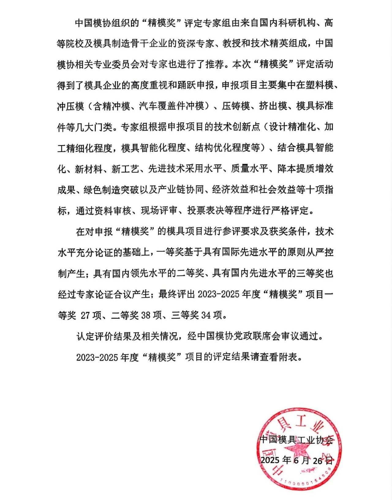 我司榮獲2023-2025年度中國模具工業(yè)協(xié)會“精模獎”,其中有兩個一等獎,以及一個二等獎。